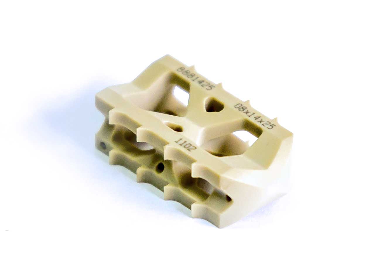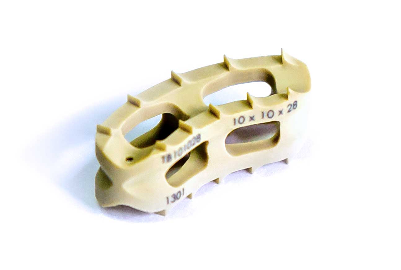 Los bordes del implante tienen barbas mecanizadas diseñadas para sujetar las placas vertebrales e impedir la expulsión.